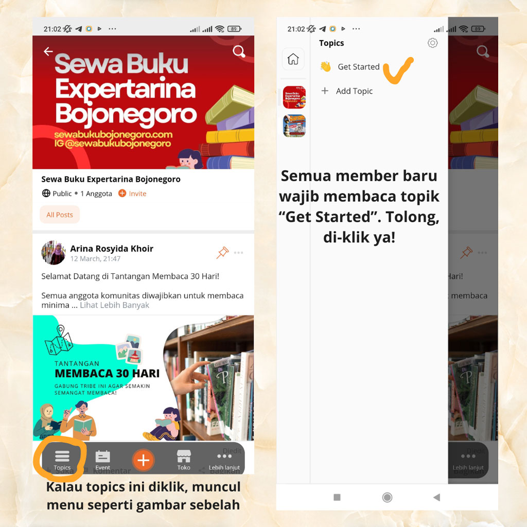 Masuk ke Tribelio dan masuklah ke tribe Sewa Buku Expertarina Bojonegoro. Kemudian, lihat bagian menu bawah. Di bagian menu bawah ada topics, event, +, toko, dan lebih lanjut. Jika tombol topics diklik, akan muncul menu samping yang berisi topik “Get Started” dan “Tantangan Membaca 30”. Semua member baru wajib membaca materi dalam topik “Get Started”. Caranya cukup klik “Get Started” lalu muncul beberapa postingan. Silakan baca postingan tersebut.