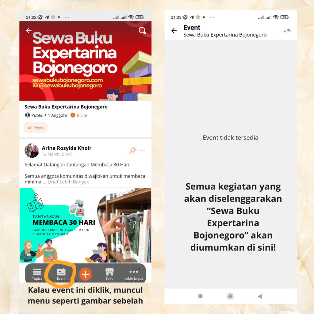 Jika tombol “Event” diklik (ditekan), maka akan muncul semua acara dari Sewa Buku Expertarina Bojonegoro. Jika kosong, berarti Sewa Buku Expertarina Bojonegoro memang belum mengadakan acara apapun.
