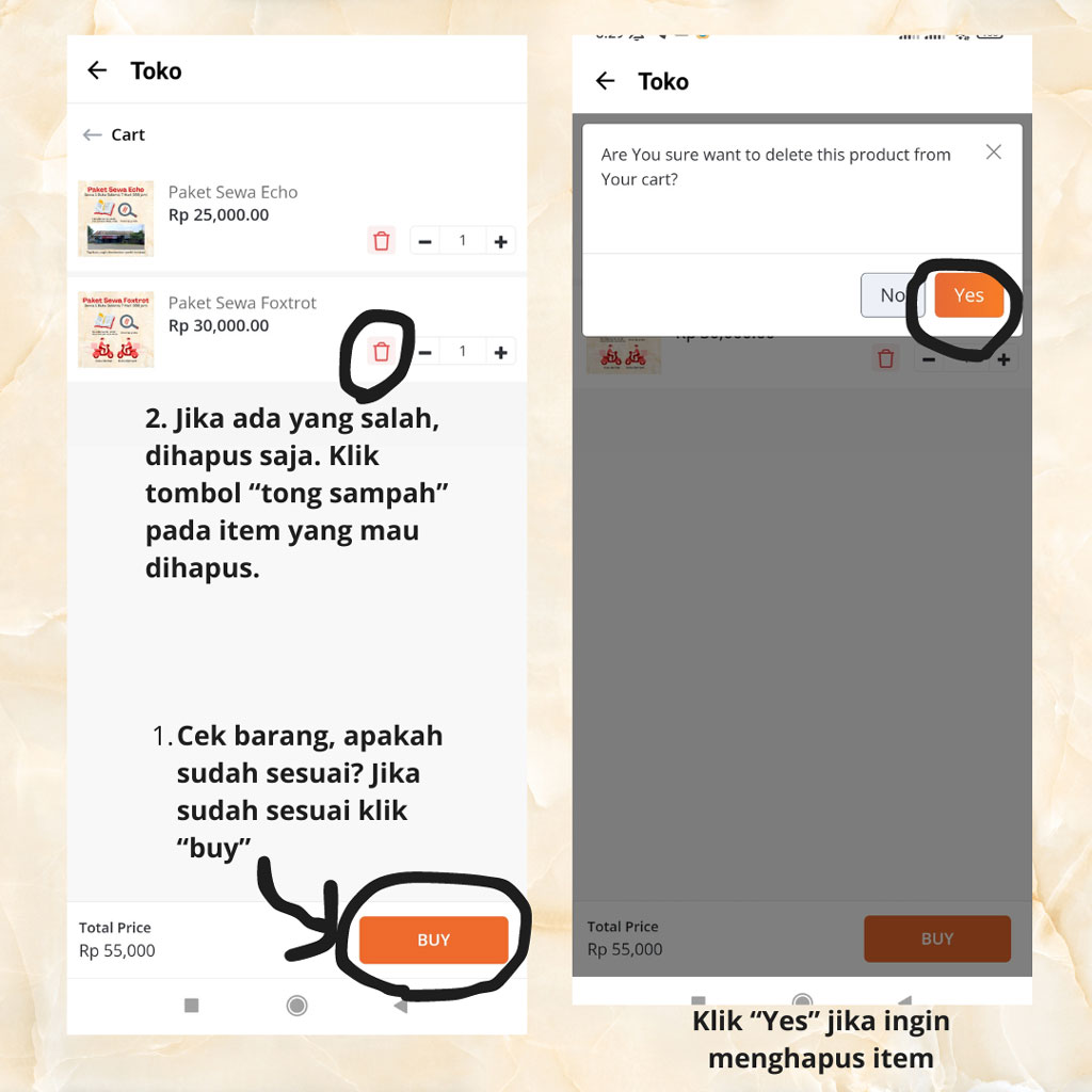 - Cek barang. Apakah sudah sesuai? Jika ada yang salah, dihapus saja. Klik tombol “tong sampah” pada item yang mau dihapus. Klik “yes” jika ingin menghapus. Jika sudah sesuai klik “Buy”.